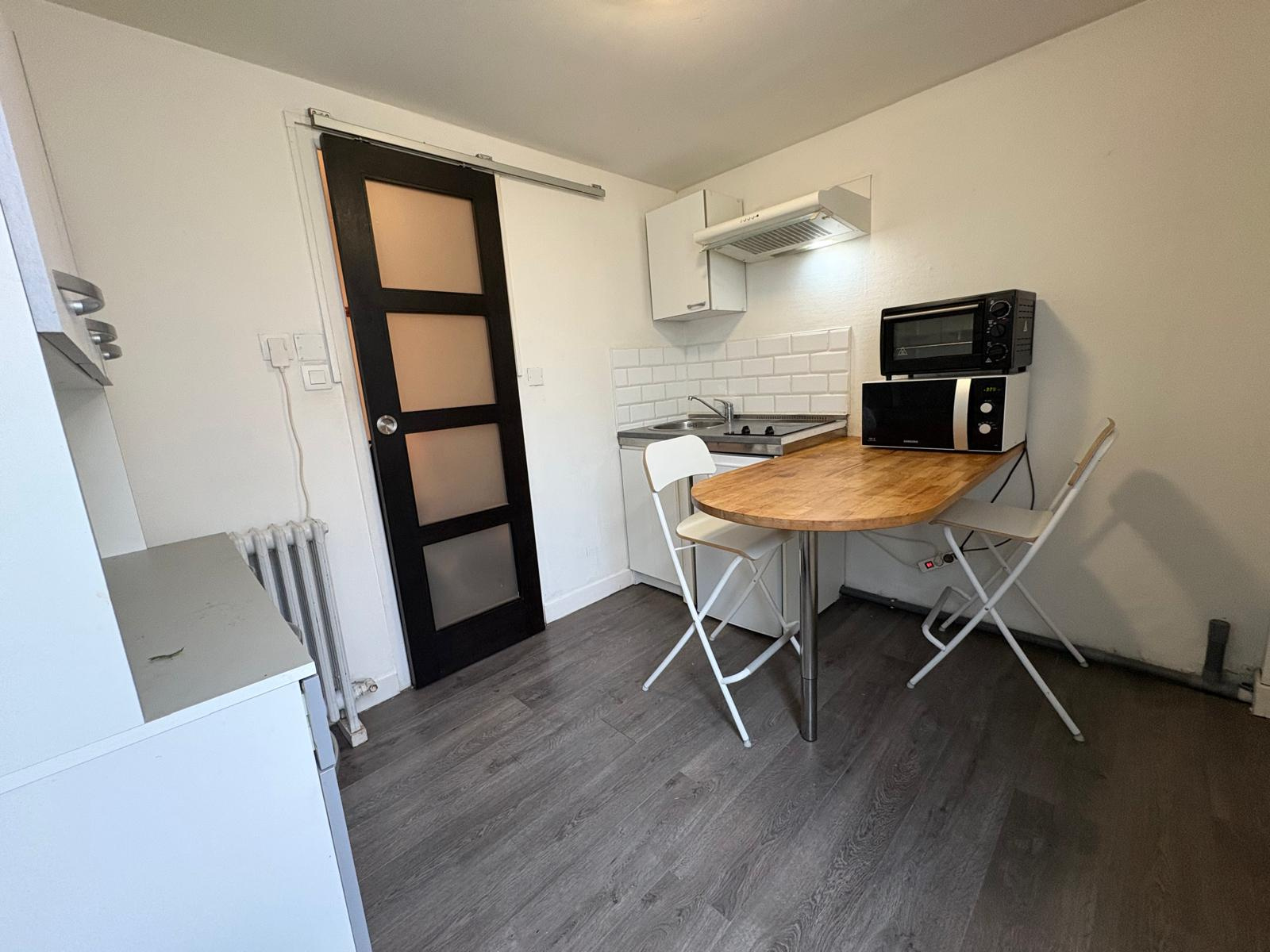 Pièce de vie avec coin bureau et nombreux rangement, cuisine indépendante équipée d'une kitchenette table bar